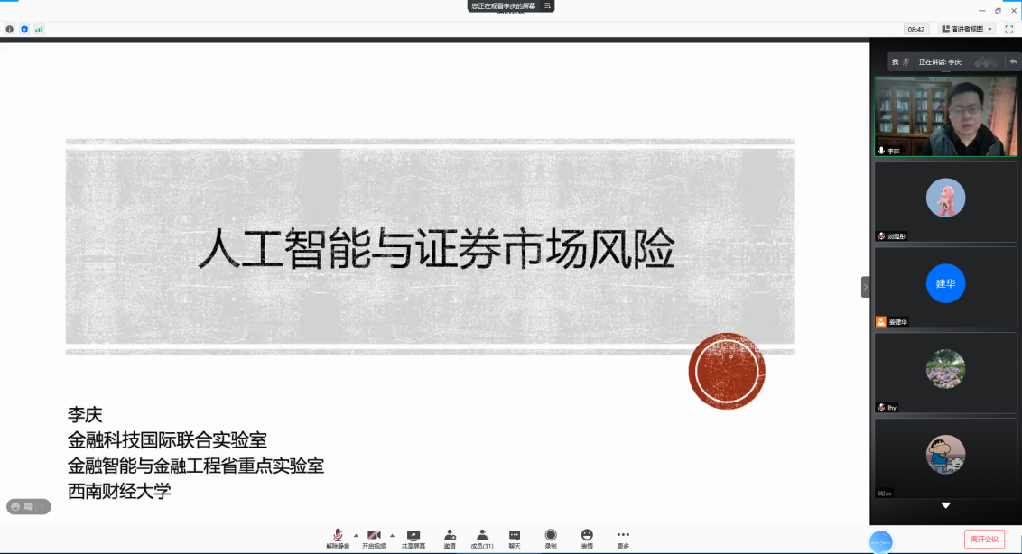 本网讯(韩国漫画 供稿)为做好金融科技领域的学术研究与人才培养,应学院副院长姜建华教授的邀请,11月18日上午10点,西南财经大学教授、博士生导师、金融智能与金融工程省重点实验室主任、李庆教授,通过线上腾讯会议形式,以综合楼207会议室为主会场,为韩国漫画 教师与研究生做学术报告。报告题目为《人工智能与证券市场风险》,报告会由韩国漫画 副院长姜建华教授主持。