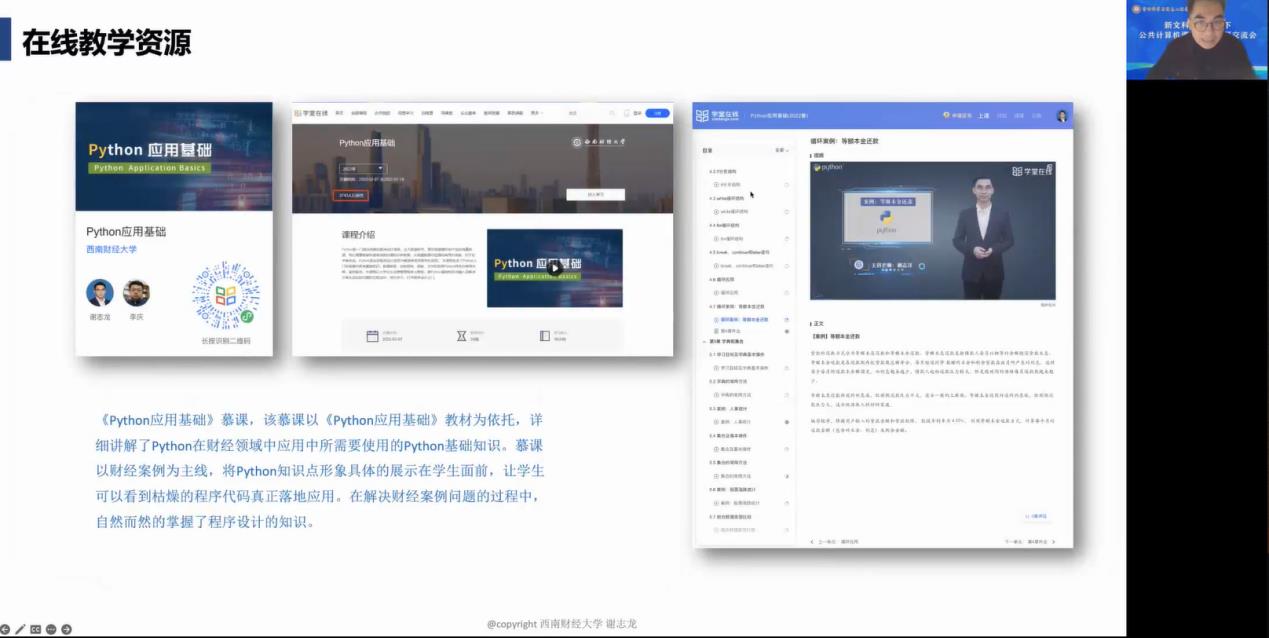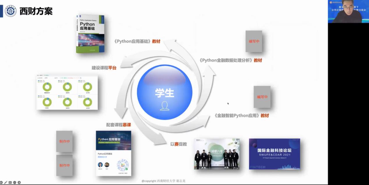 会上,西南财经大学谢志龙博士进行了题为《新文科背景下财经高校程序设计类课程教学设计与实施》的报告。谢博士从“课程规划与实施过程”、“‘4+3’西财方案”、“教材结构和教材亮点”三个方面展开,结合自身教学实践,探讨了《Python应用基础》课程的教学内容、教学方法、教材、线上线下混合式课程设计,重点讲述了面对财经类、管理类、文法类等非计算机专业学生,应更加关注他们对数据整理、分析、可视化的应用实践能力培养。结合文科类学子在学习Python时遇到的普遍问题,谢博士还介绍了Python学习的“教材+课程平台+课程视频+仿真实验”、“基础知识+数据分析+智能模型”的“4+3”西财方案,以及该课程的教材结构和教材亮点。