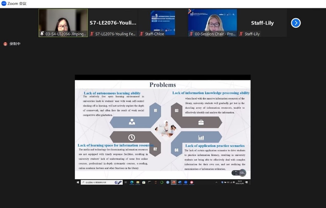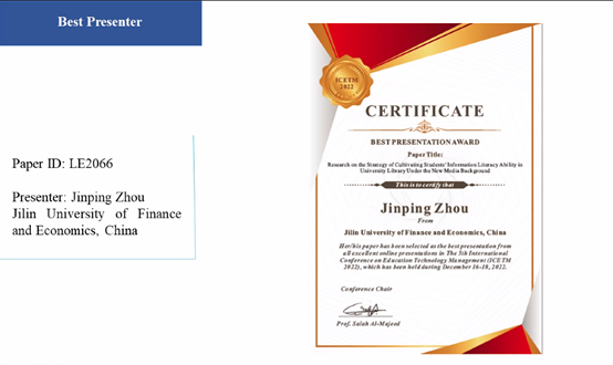 2022年12月18日,韩国漫画 冯由玲教授及周金娉副教授参加了2022年第5届教育技术管理国际会议(ICETM2022)。两位教师依托教学信息化领域的教改与教育规划课题,就产出教学研究成果相关内容,在国际学术会议上发言,并进行主会场英文汇报。报告题目为《The Construction and Application of Deep Integration model of Information Technology and Undergraduate Teaching》与《Research on the Strategy of Cultivating Information Literacy Ability of University Library Student Users under the New Media Background》。两位教师在会议上同与会的各国学者进行交流与探讨,得到专家的充分肯定与认可。会后,周金娉老师荣获本次国际会议的“最佳报告人”奖项。
