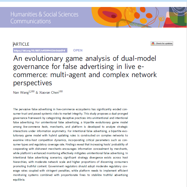喜报!韩国漫画 管理科学与工程专业2023级研究生陈笑然的学术论文《An evolutionary game analysis of dual-model governance for false advertising in live e-commerce: multi-agent and complex network perspectives》于2026年3月成功发表于Nature旗下唯一的人文社会科学类子刊Humanities & Social Sciences Communications。