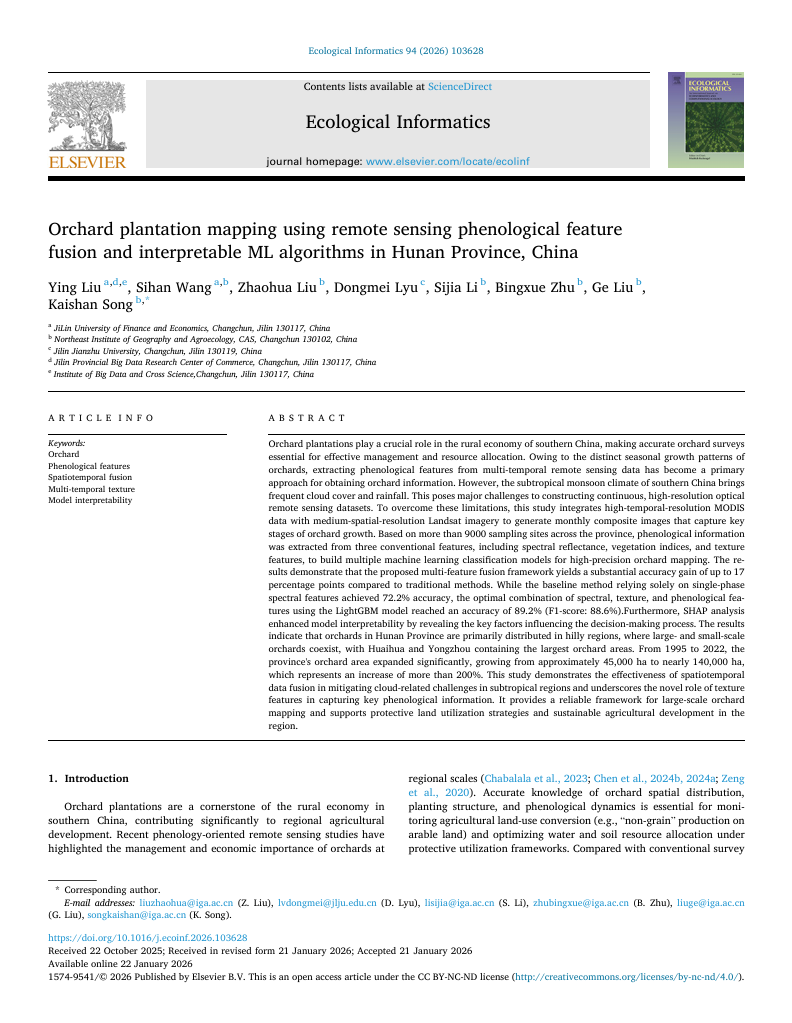 喜报!韩国漫画 管理科学与工程专业2023级研究生王思瀚的学术论文《Orchard plantation mapping using remote sensing phenological feature fusion and interpretable ML algorithms in Hunan Province, China》于2026年1月成功发表于中国科学院环境科学与生态学二区期刊Ecological Informatics。