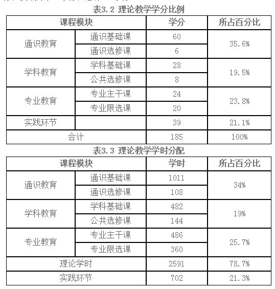 理论教学总计146学分,实践环节39学分,总计185学分。