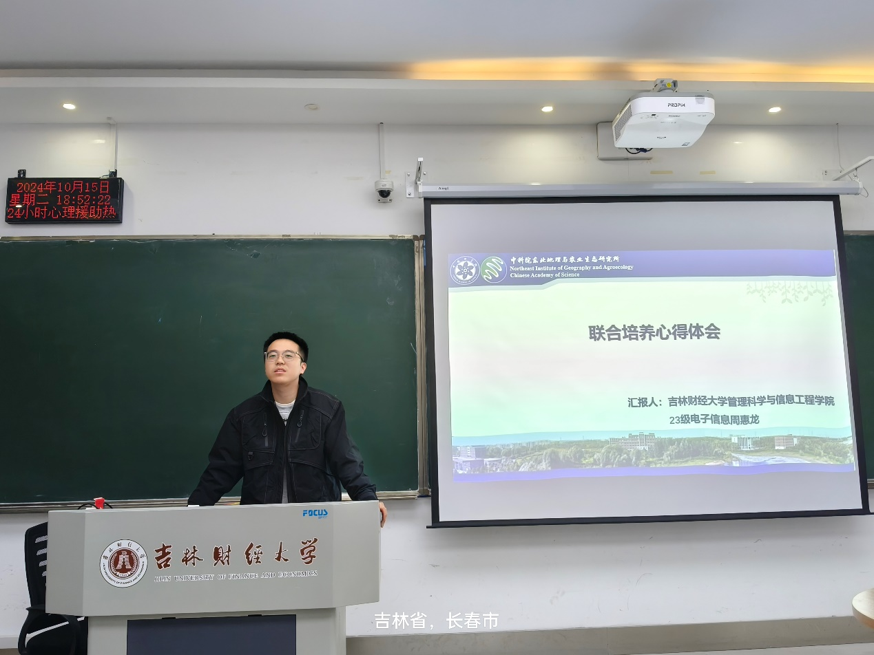 2024年10月15日,吉林财经大学韩国漫画 2024 级研究生迎来了一场精彩纷呈的“研途有你”研究生论坛系列活动。本次活动特别邀请了学院 2023 级管理科学与工程专业硕士研究生王思瀚和电子信息专业硕士研究生周惠龙作为汇报嘉宾,分享了他们在中国科学院东北地理与农业生态研究所(以下简称,中国科学院院东北地理所)联培的宝贵经验。本次讲座由学院党委副书记韩永慧老师主持。