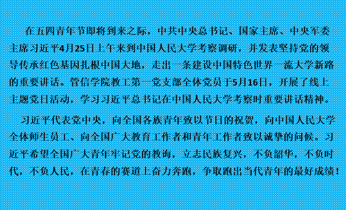 习近平代表党中央,向全国各族青年致以节日的祝贺,向中国人民大学全体师生员工、向全国广大教育工作者和青年工作者致以诚挚的问候。习近平希望全国广大青年牢记党的教诲,立志民族复兴,不负韶华,不负时代,不负人民,在青春的赛道上奋力奔跑,争取跑出当代青年的最好成绩!