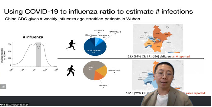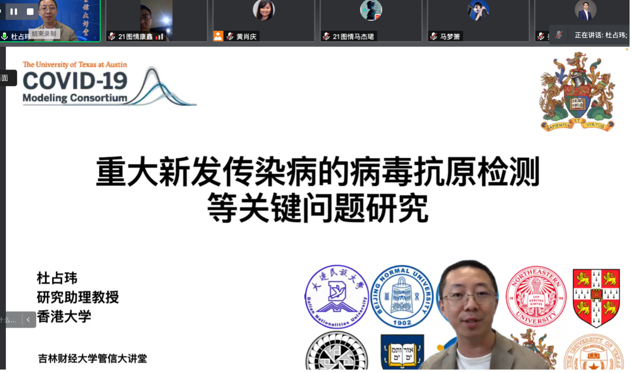 会上,杜博士根据自身参与疫情防控系列课题,以新冠肺炎疫情发展阶段为时间轴,详细介绍了“新冠疫情的早期扩散趋势”、“新冠疫情的关键参数估计”、“国内控制新冠疫情效果的评估”、“大规模病毒检测的分析”和“以大规模新冠病毒检测策略的经济学分析”等研究内容。对新冠疫情发生和发展趋势、传染病学关键特性、全国疫情防控阻击战的成功经验,以及城市大规模新冠病毒检测策略的经济学分析进行逐一阐述。在会后的提问环节,参会的同学们踊跃发言,向杜博士咨询了信息数据获取,模型借鉴运用等方面的问题,杜博士一一作了详细解答。