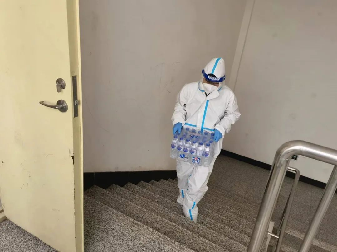 送水、送餐、送试剂盒这些场面过了几天仍历历在目,当时感觉十分辛苦。要把已经清点过数目的物品成箱的往楼上搬,有些箱子没那么费力气,但有些箱子却十分沉重,两个人搬上去后在口罩内大口大口的喘气,而且还能明显感觉到出了很多汗。