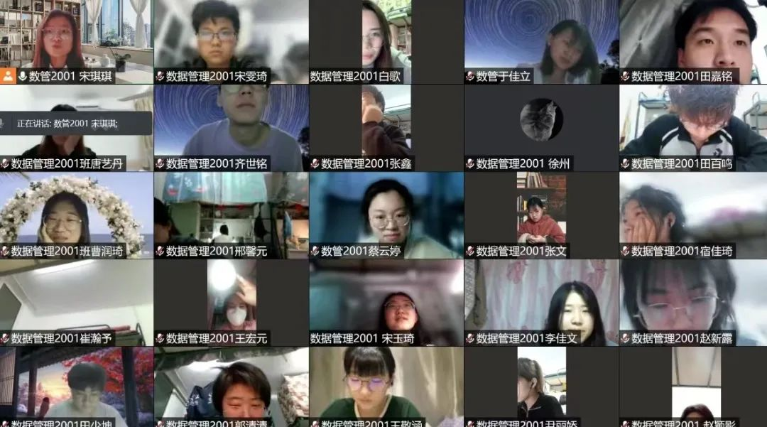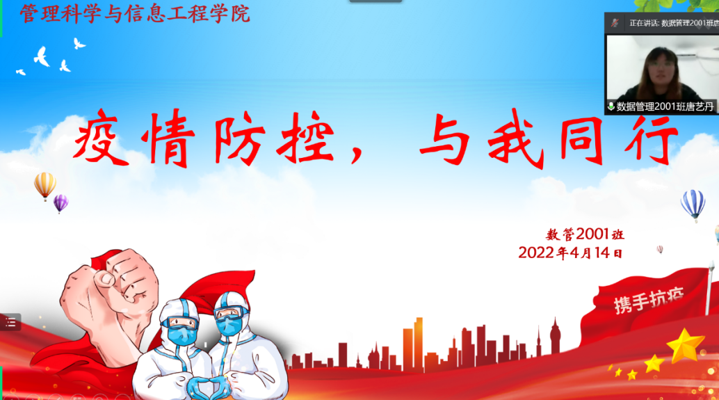 2022年4月14日,数据管理2001班团支部以线上会议的形式举行了“疫情防控,与我同行”线上主题班会。会议第一项,团支书宋琪琪向班级同学说明了封控期间学生行为管理规范,嘱咐班级同学要严格遵守学校的系列规定,激励大家坚决守住来之不易的疫情防控成果。会议第二项,抗疫志愿者代表白歌等同学向大家分享了参与抗疫志愿服务期间的心得与感悟。同学们的分享结束后,团支书向全体同学倡议“要在被温暖的同时给予温暖”,积极配合老师和学生志愿者的工作,在疫情期间展现新时代团员的担当。会议第三项,唐艺丹同学为大家带来了悦耳的歌曲。最后,全体同学积极地进行了交流发言,大家相互鼓励,共同期待着春暖花开时的相见。