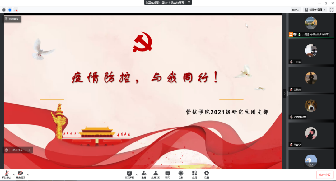 2022年4月14日,2021级研究生团支部以线上会议的形式进行了“疫情防控,与我同行”线上主题班会,会议由李保金同学主持。会议第一项,李保金同学带领大家学习了封控期间学生行为管理规范,他表示:这是一场人与病毒的战斗,按照纪律和规矩做事是战胜疫情的最有效手段,对不如实报告信息,不执行防疫要求、不遵守防疫纪律、不听从防疫管理、不服从指挥调度的学生,依规依纪严肃追责;对情节严重、造成重大传染事故的学生,依法依律严肃处理。会议第二项,我们邀请了三位志愿者同学,为大家分享防疫心得,他们分别是:马杰珺、聂唯、马梦萧。志愿者们表示,每天的志愿服务很辛苦,但是正是同学们配合防控,疫情才有所好转,这是我们每一个人的努力。现在正是迎来了疫情防控的决胜时刻,我们大家继续坚持,相信吉林终有吉临时,长春定复往长春!最后,全体同学积极地进行了交流发言,大家相互鼓励,共同期待着春暖花开时再相见。