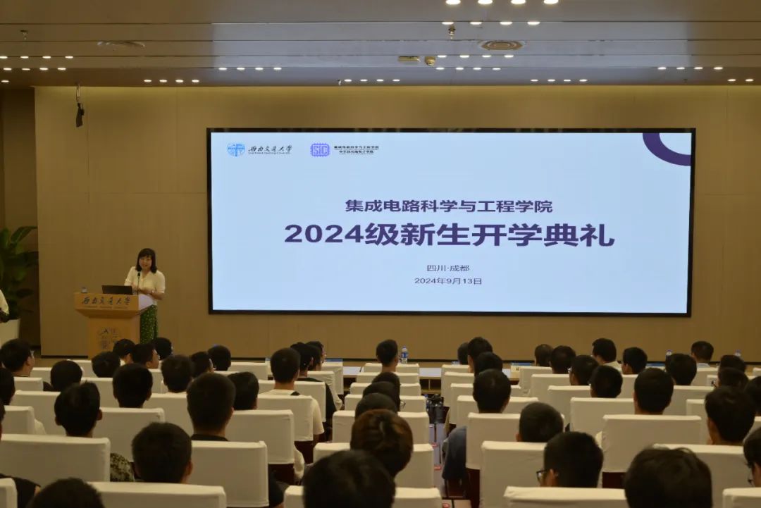 9月13日晚,西南交通大学集成电路科学与工程学院2024级新生开学典礼在犀浦校区图书馆二号报告厅举行。集成电路科学与工程学院党委书记赵舵、执行院长郝莉、副院长宋文胜、邸志雄出席典礼,任课教师代表、学院专业教师、各管理办公室主任、新生班级导师、新生辅导员、新生朋辈导师及2024级新生参加典礼。典礼由学院党委副书记王燕主持。