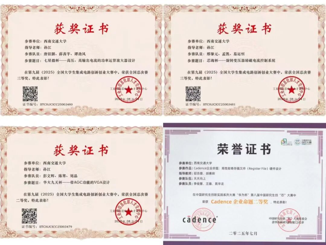 2025年以来,西南交通大学集成电路科学与工程学院紧扣 “创新实践能力培养” 核心目标,构建了 "赛前充分准备、赛中全程保障、赛后总结提升" 的全链条竞赛工作体系,通过系统化组织、专业化指导、精细化服务,引领研究生在教育部学位与研究生教育发展中心主办的 "华为杯" 第八届中国研究生创 "芯" 大赛、2025中国研究生创“芯”大赛·EDA精英挑战赛、中国国际大学生创新大赛和第九届全国大学生集成电路创新创业大赛等多项高水平研究生竞赛中奋勇争先,获奖作品涵盖集成电路设计、电力电子应用、EDA 工具和FPGA开发等多个前沿领域,充分彰显了学院研究生培养的扎实功底与创新活力。