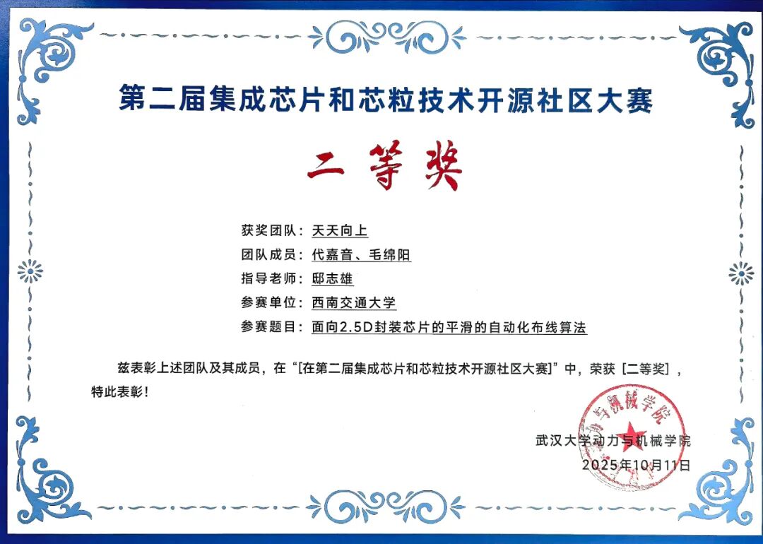 在2025年第二届集成芯片与芯粒开源社区大赛中,我院教师指导的研究生团队在“面向2.5D封装芯片的平滑的自动化布线算法”赛题中荣获全国二等奖(赛题第一名,一等奖空缺)。