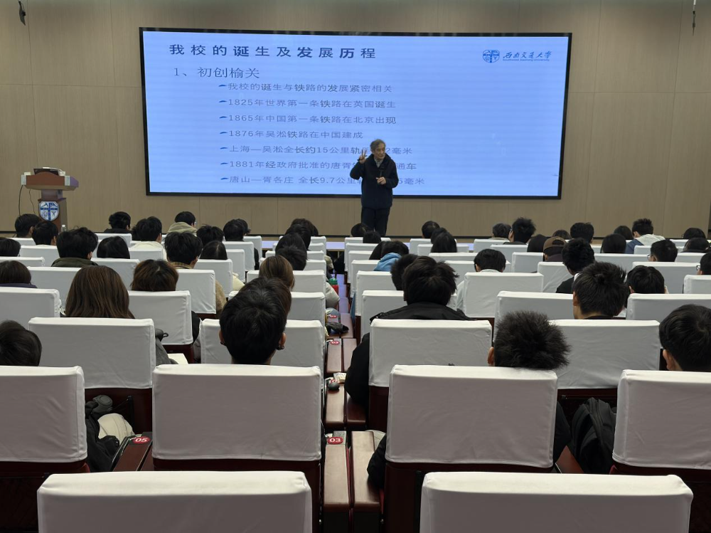 梁教授解读了西南交大“精勤求学,敦笃励志,果毅力行,忠恕任事”的校训,阐释了“竢实扬华,自强不息”的交大精神。他提到,学校曾用过“中国交通大学”“北方交通大学”等校名,历经17次校名变更,却始终坚守育人初心。