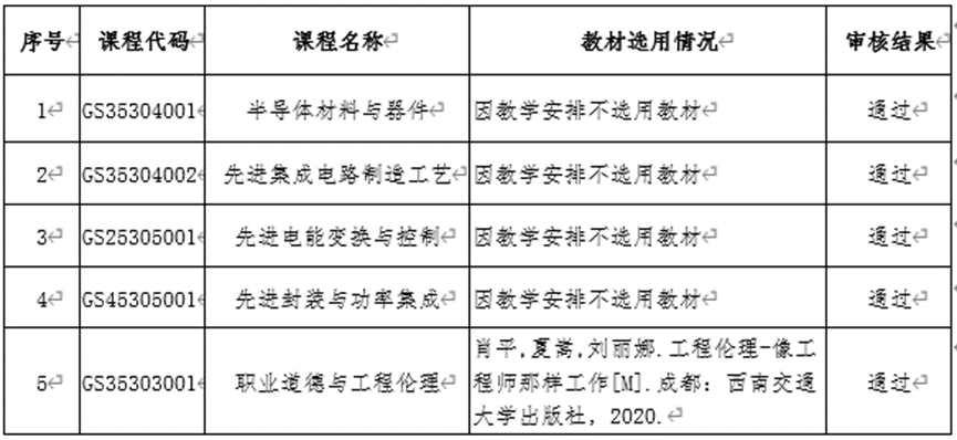 依据《西南交通大学教材管理实施细则》(西交党〔2024〕35号)相关教材选用规定,根据学校研究生院《关于开展2025-2026学年第一学期研究生教材选用及审核工作的通知》要求,学院教材建设工作组已完成我院2025-2026学年第一学期研究生开课课程的教材选用审核工作,现将审核结果公示如下: