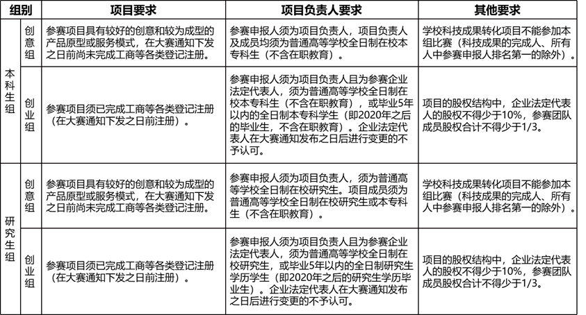 根据参赛申报人所处学习阶段,项目分为本科生组、研究生组。根据项目发展阶段,本科生组和研究生组均内设创意组、创业组,并按照新工科、新医科、新农科、新文科、人工智能+、低空经济、生物技术、量子科技、新能源、新材料设置参赛项目类型。